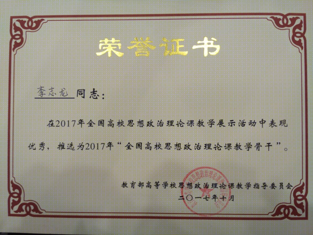 教师李志龙荣获“全国高校思想政治理论课教学骨干”荣誉称号