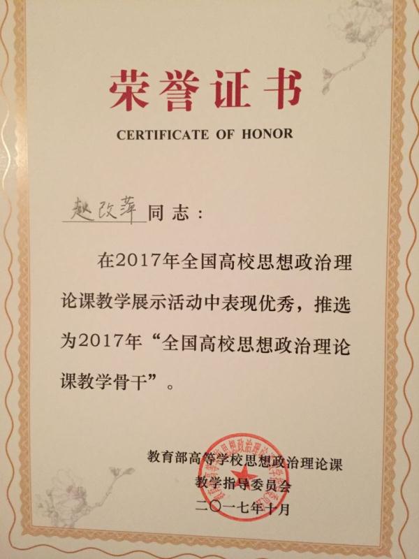 教师赵改萍代表山西省参加了现场教学展示,并荣获“全国高校思想政治理论课教学骨干”的荣誉称号。