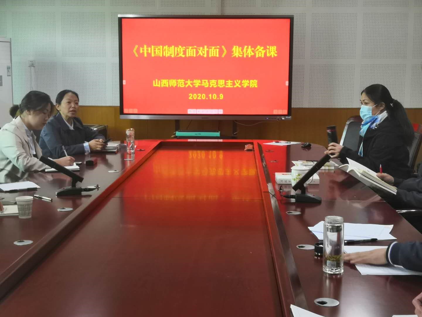 在科学会堂A508会议室举行“中国制度面对面”走进思政课课堂的集体备课。全体教师参加,教学副院长赵改萍主持。运城职业大学李国娟、罗舒贤两位教师于10月9日下午观摩并参加讨论。