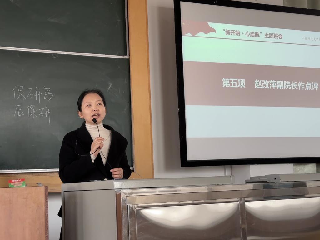 活动第五项,赵改萍副院长对此次班会作点评。赵院长肯定了联系班级对此次活动的充分准备,从《青年在选择职业时的考虑》和《雷锋日记》两篇经典文献的共性谈起,强调立足新时代新征程,中国青年的奋斗目标和前行方向归结到一点,就是坚定不移听党话、跟党走,努力成长为堪当民族复兴重任的时代新人;同时,也从学会学习、学会做人和学会思考三个层面为大家作辅导,引导同学们树立终身学习、广泛学习和深度学习的理念,把对祖国血浓于水、与人民同呼吸共命运的情感贯穿学业全过程、融汇在事业追求中。