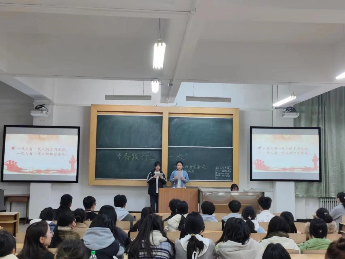班会第一项,由大学生理论宣讲团成员进行党的二十大主题宣讲,一代人有一代人的复兴道路,一代人有一代人的担当使命。新时代的新青年要深入学习领会习近平总书记在党的二十大的重要讲话,继承和发扬党的攻坚克难精神,不忘初心、牢记使命,不畏艰险砥砺前进,担时代之重任,逆时代之洪流,以饱满的精神与满腔的热情担负起中华民族伟大复兴梦,在民族复兴的征程上越走越远!