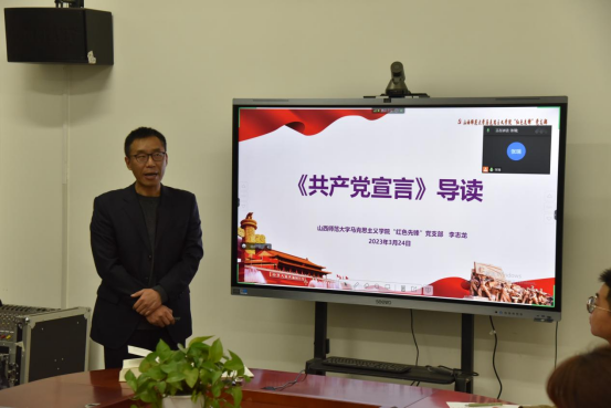 接下来,李志龙同志带领大家进行经典原著的研读。在研读的过程中引导大家感受《共产党宣言》的科学力量和价值魅力在于它揭示了人类社会发展的一般规律,论证了社会主义代替资本主义的历史必然性,阐明了无产阶级和人类解放的条件和现实道路,预示了共产主义社会的美好前景,昭示了共产党人的初心和崇高理想。同时通过观看相关视频片段和轮流朗诵的方式使大家在趣味中感受原著的魅力。