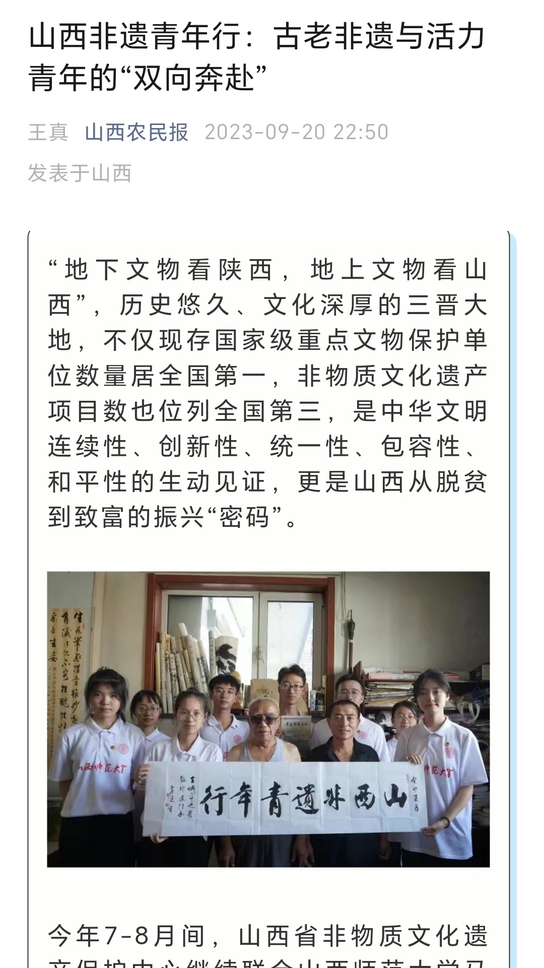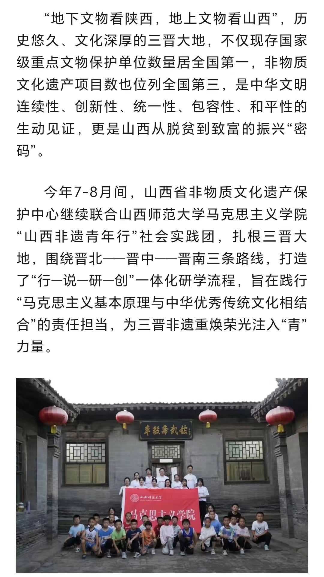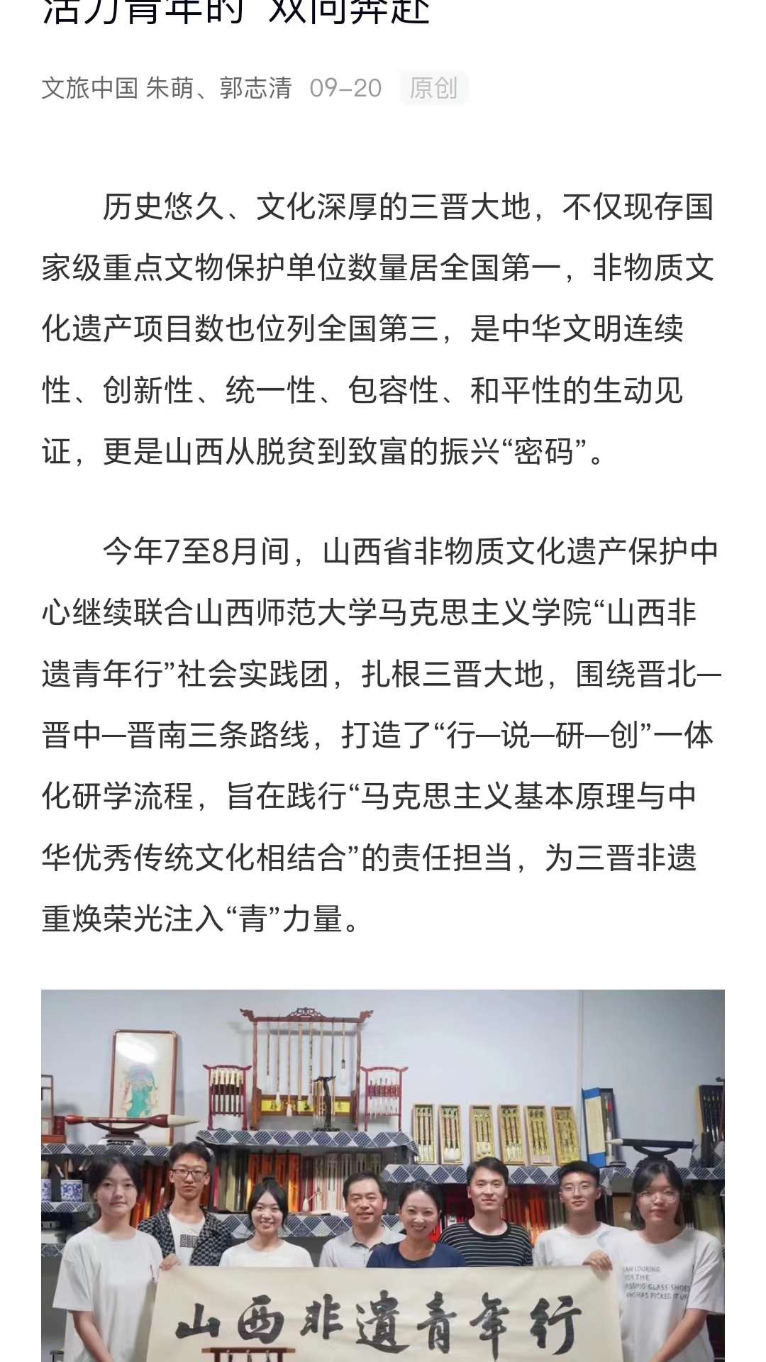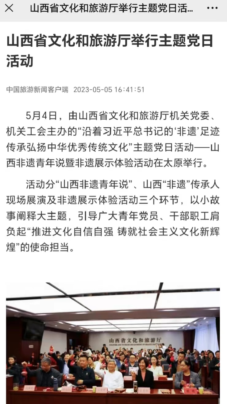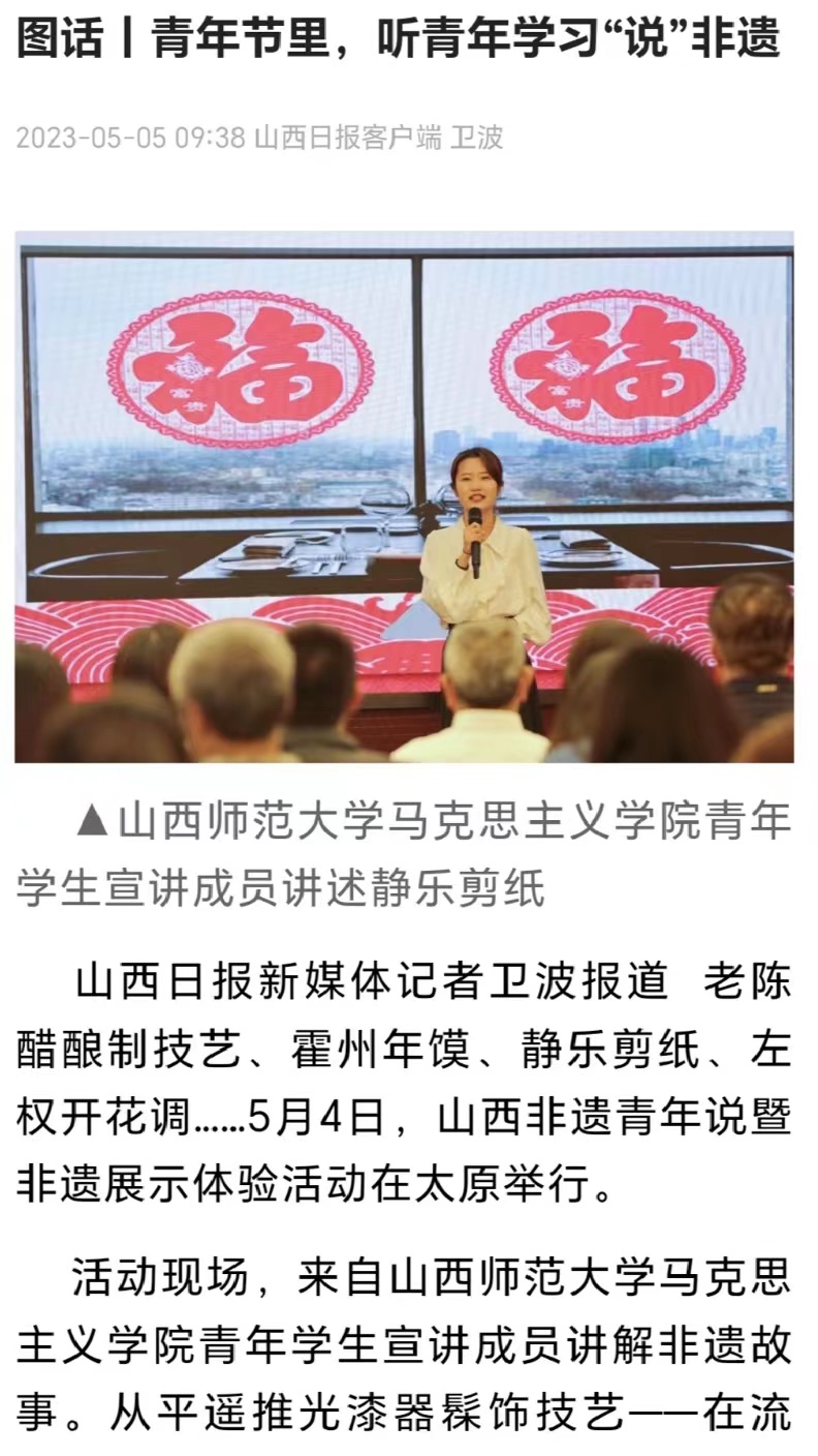 “山西非遗青年行”社会实践团队聚焦山西非遗,在山西省非物质文化遗产保护中心的大力支持下,开展了“山西非遗青年行+山西非遗青年说+山西非遗青年创+山西非遗青年研”系列活动,打造了“行—说—创—研”一体化研学流程,获得人民论坛网、人民日报视频客户端、人民网、中国青年报、文旅中国、山西省文旅厅、河南省文旅厅、山西日报山西青年报、山西农民报、中国大学生在线、高校辅导员工作室等多家权威机构和媒体的广泛报道。
