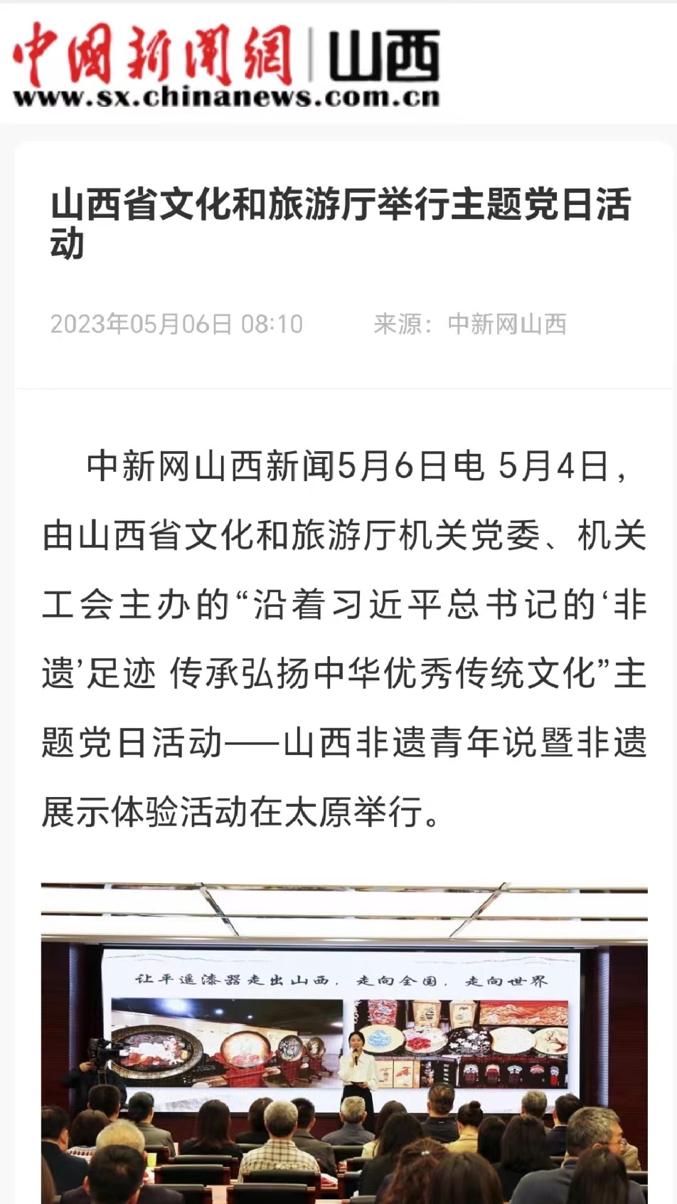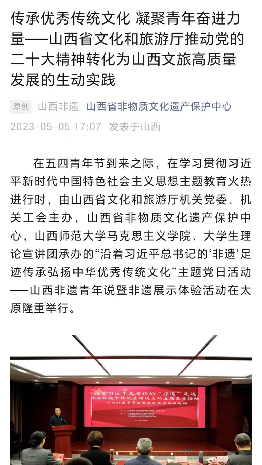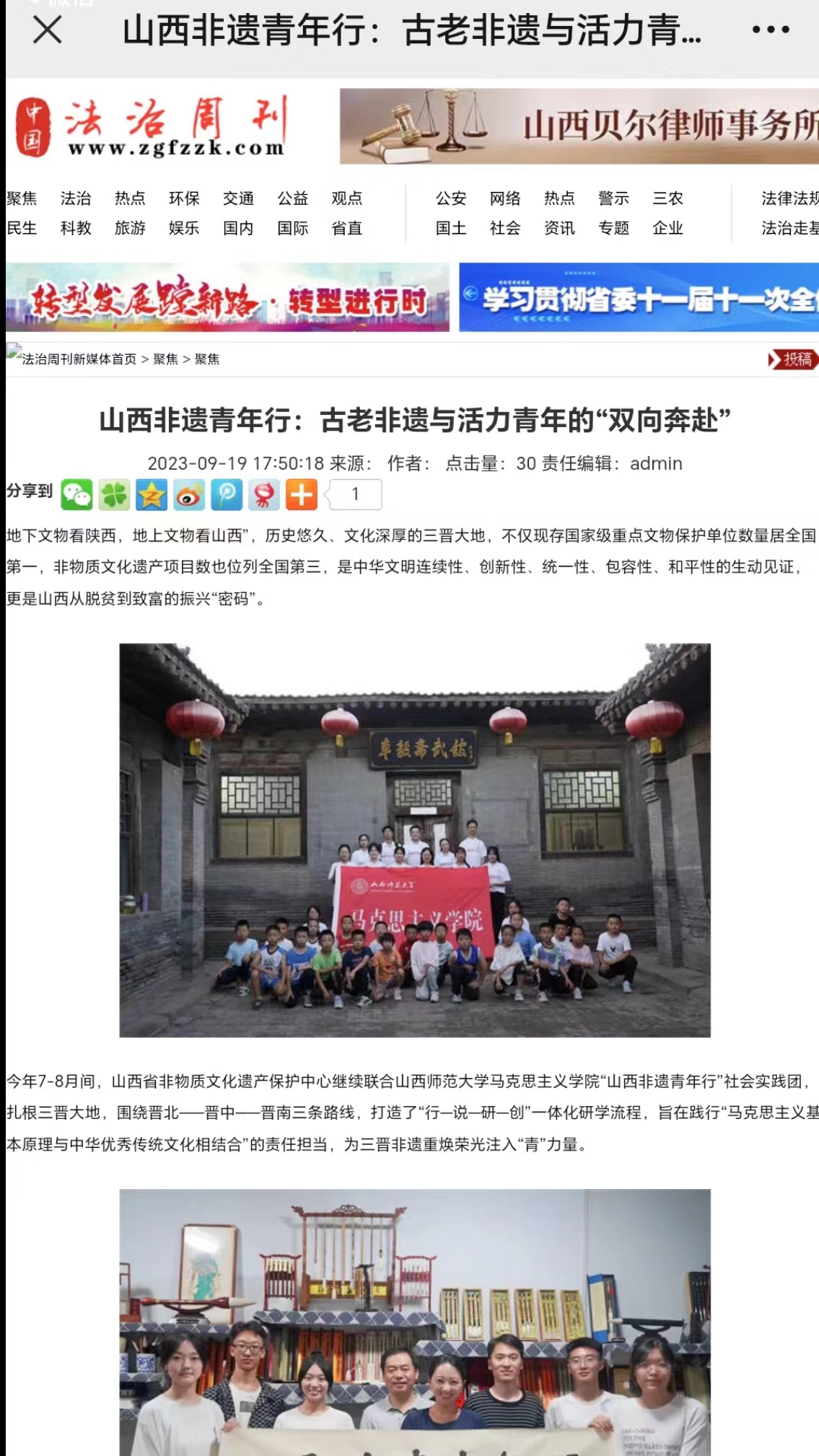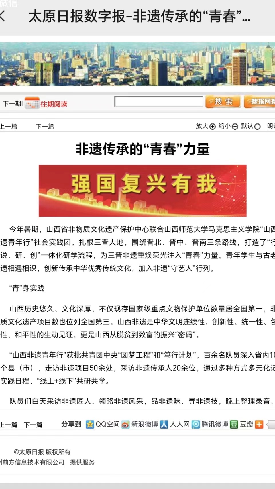 “山西非遗青年行”社会实践团队聚焦山西非遗,在山西省非物质文化遗产保护中心的大力支持下,开展了“山西非遗青年行+山西非遗青年说+山西非遗青年创+山西非遗青年研”系列活动,打造了“行—说—创—研”一体化研学流程,获得人民论坛网、人民日报视频客户端、人民网、中国青年报、文旅中国、山西省文旅厅、河南省文旅厅、山西日报山西青年报、山西农民报、中国大学生在线、高校辅导员工作室等多家权威机构和媒体的广泛报道。