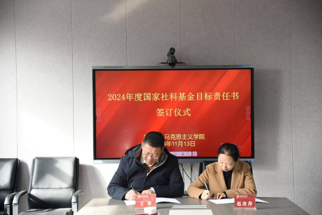 首先,社科部王彤部长介绍了学校关于开展2024年度国家社科基金项目申报相关工作安排和签订目标责任书的目的意义。其次,科研副院长吉志强汇报了学院开展2024年度国家社科基金项目申报工作的安排和进度。再次,赵改萍副院长(主持行政工作)简要介绍了学院项目申报的后期打算和计划,提出要在“请进来和走出去”中加强先进经验学习和强化项目申报书论证,不断提升申报书质量和提高项目申报中标率。最后,赵改萍副院长(主持行政工作)同王彤部长签署了2024年度国家社科基金项目申报目标责任书。