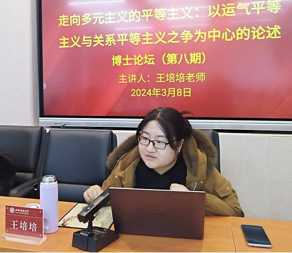 首先,王培培老师作了题为《走向多元主义的平等主义:以运气平等主义与关系平等主义之争为中心的论述》的报告。她从运气平等主义的起源、代表人物、内部争论出发,指出运气平等主义是西方平等理论的最新发展之一,它的内部争论构成了其基本的理论概貌。