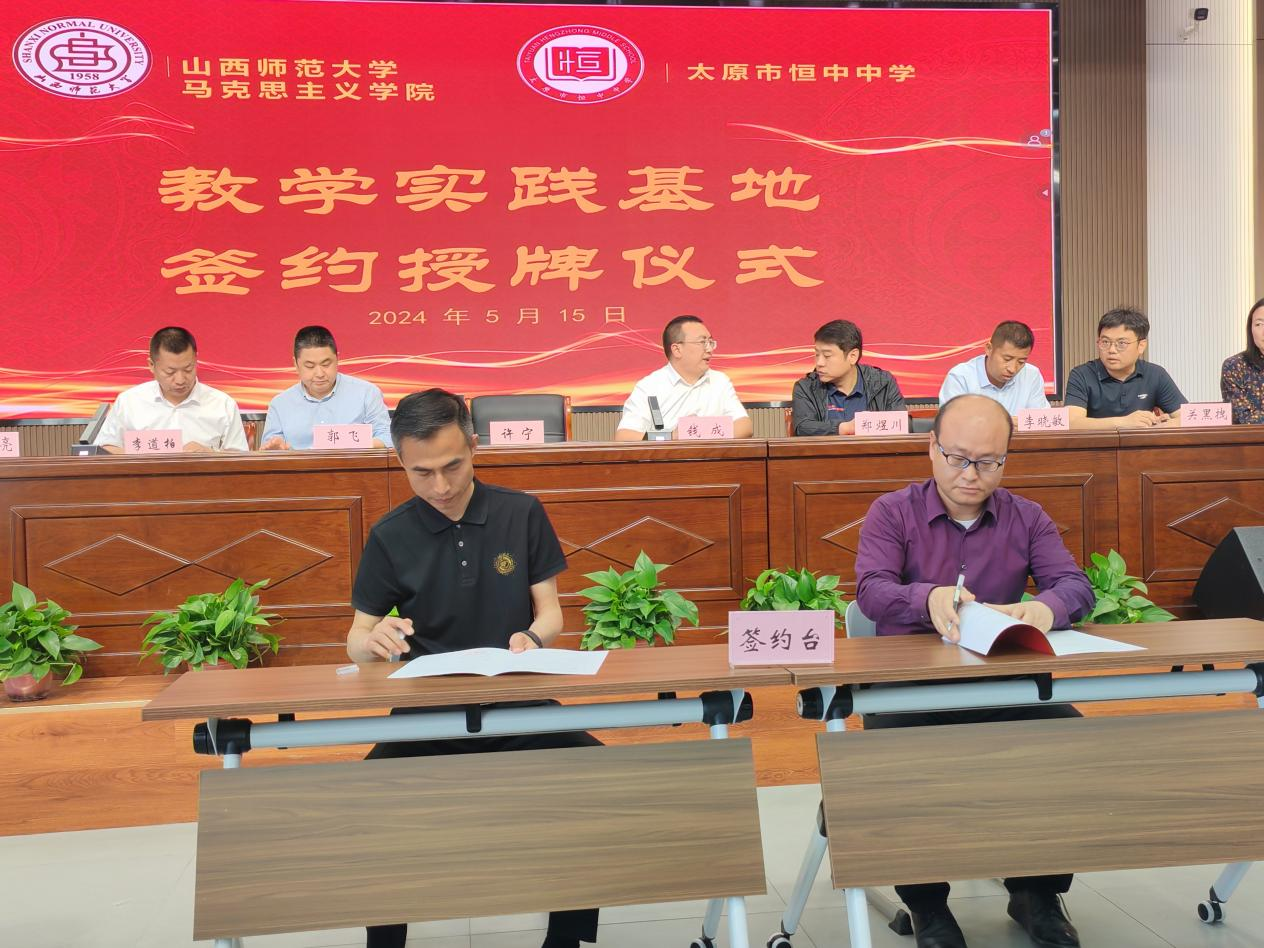 仪式上,太原市恒中中学校董事长许宁与副院长(挂职)杨海亮共同签署教学实践基地协议书,副院长(挂职)杨海亮为太原市恒中中学校授牌。此次活动对于扩大思想政治教育专业学生教学实践平台,增强同人漫画 服务山西基础教育能力具有推动意义。
