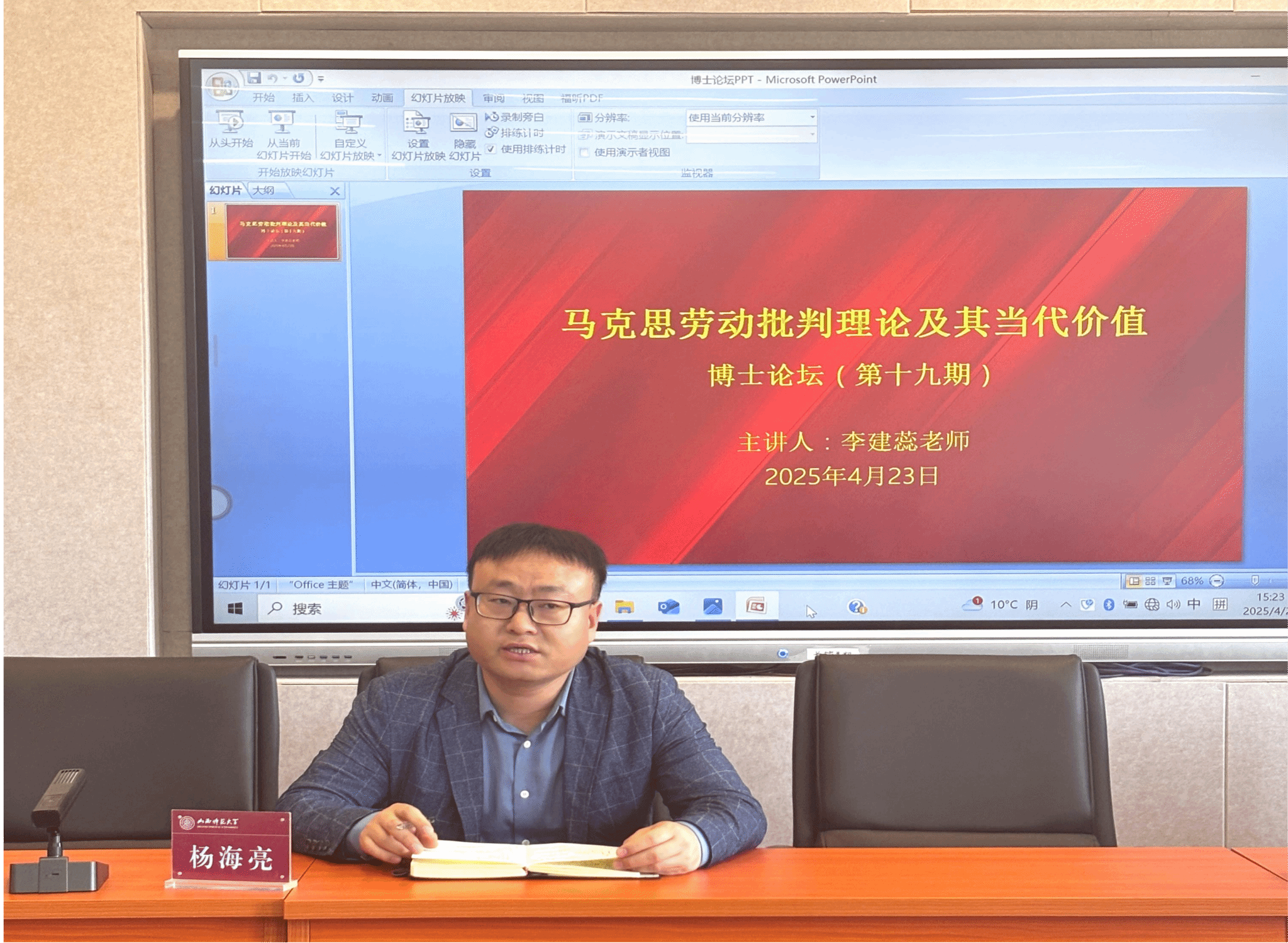 随后,李老师阐明了马克思劳动批判理论的基本内容。马克思劳动批判理论揭示了资本主义劳动生产关系的内在本质性,并对这种内在本质进行遮蔽的资本意识形态进行揭露,异化劳动、雇佣劳动、国民经济学劳动理论和黑格尔的劳动理论是马克思劳动批判的基本对象。在论坛的最后,李老师总结归纳了马克思劳动批判理论的理论意义与当代价值。李老师指出,自由劳动、劳动解放及人的解放三个方面架构起了马克思劳动批判理论价值旨趣的内在结构。自由劳动是劳动解放的表现形态,劳动解放是人的解放的进阶桥梁,人的解放是马克思劳动批判的终极旨趣,并指出马克思劳动批判理论意味着马克思劳动价值论的再出场,实现了当今时代劳动新形态和马克思劳动批判的新解读,体现了当代劳动新境遇的构建。
