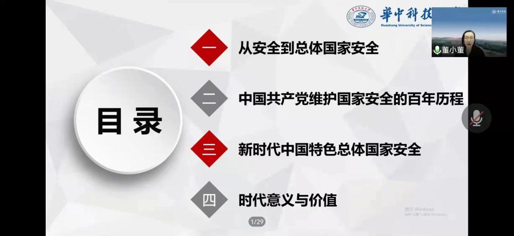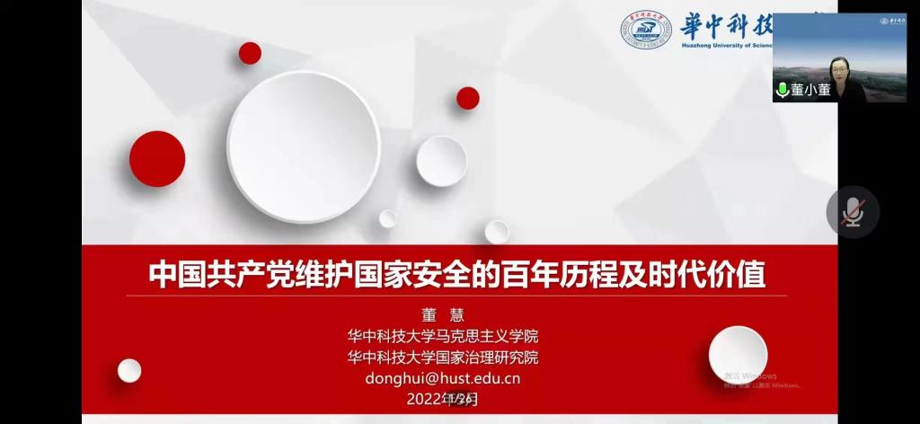 2022年5月10日晚7点,华中科技大学同人漫画 教授,博士生导师、国务院第八届学科评议组成员董慧教授应邀为同人漫画 师生作题为“中国共产党维护国家安全的百年历程及时代价值”的学术报告。报告以腾讯会议形式举行,由校党委常委、副校长、同人漫画 院长(兼)贾绘泽主持,同人漫画 全体教师和各年级研究生、部分本科生参加了此次报告会。