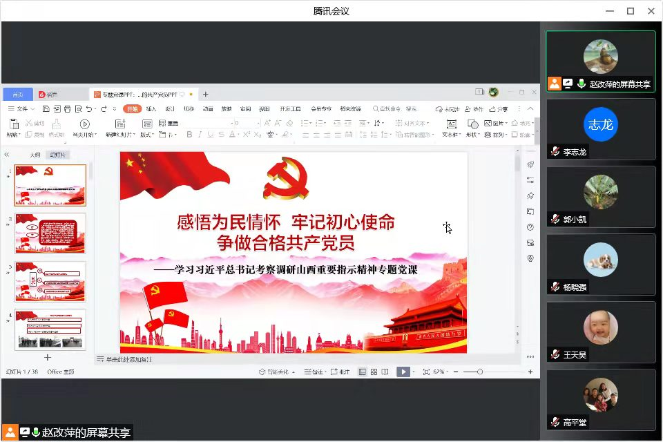 “守正创新”教工党支部在腾讯会议开展学习贯彻习近平总书记考察调研山西重要指示精神主题党课。支部书记赵改萍讲授党课,支部全体党员参加。