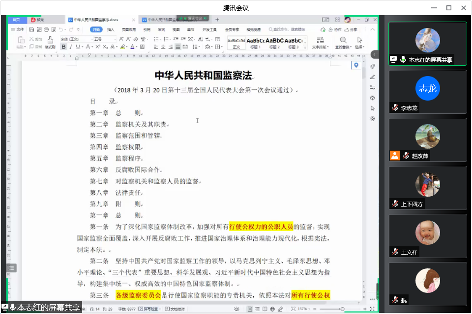 “守正创新”教工党支部于2022年5月31日晚7点半在腾讯会议开展“学习监察法实施条例 增强廉洁自律意识”线上主题党日活动。此次主题党日活动由支部书记赵改萍主持,支部全体党员参加。