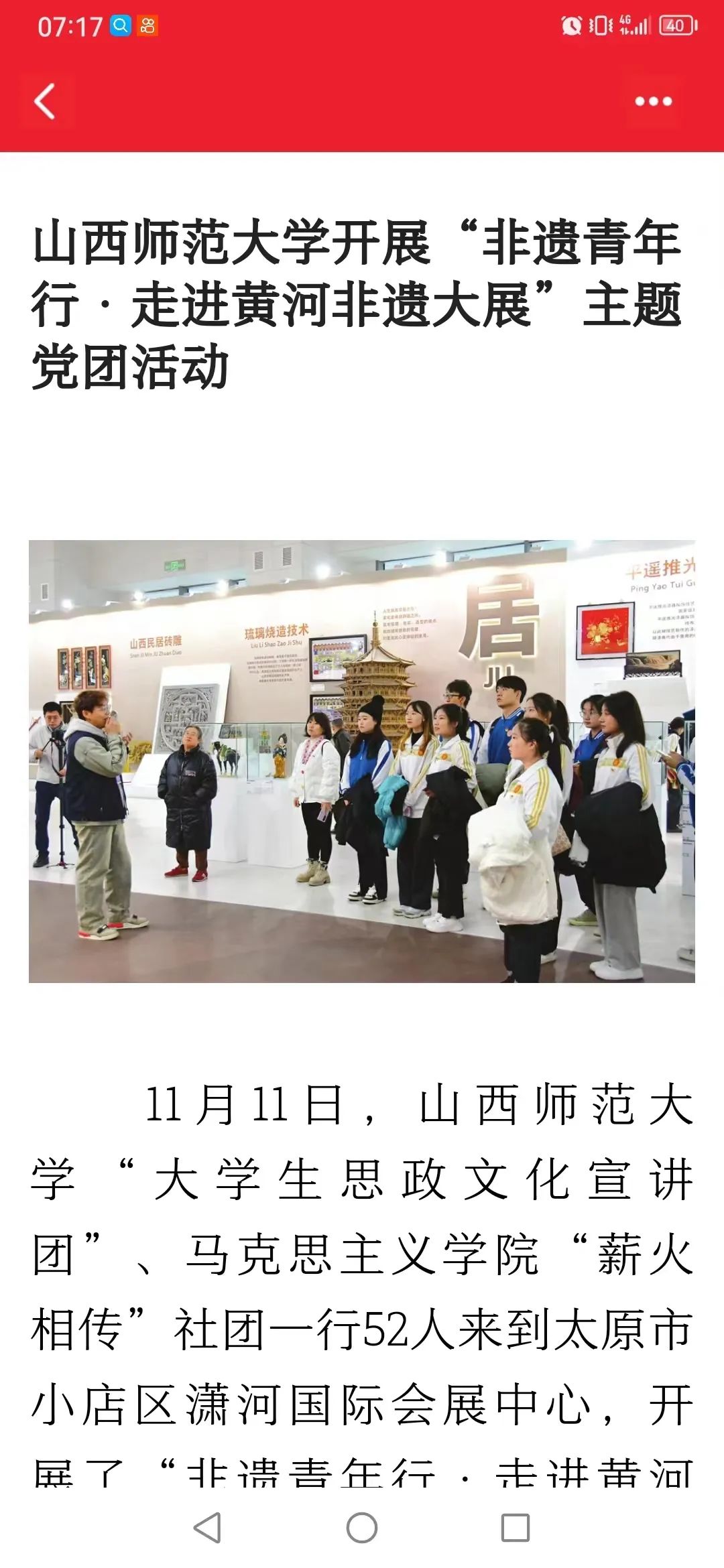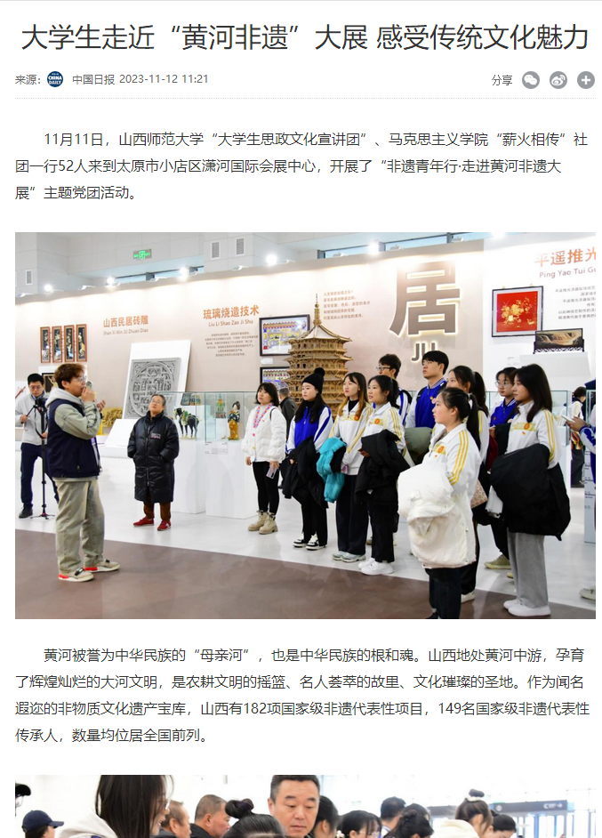 将坚持继续发挥“山西非遗青年行”特色优势,让学生在“行—说—研—创”一体化研学中体验非遗、诉说非遗、感悟非遗、助力非遗,让非遗的种子在三晋大地上遍地开花,生生不息,迸发出无限的生机与活力。