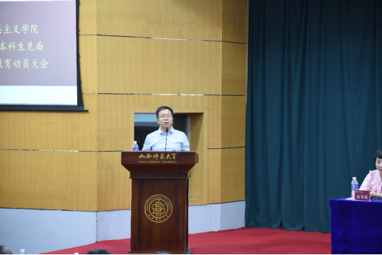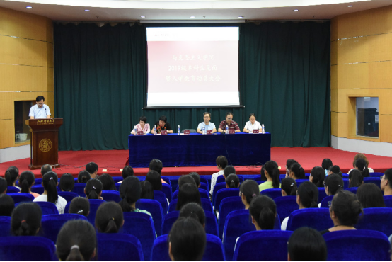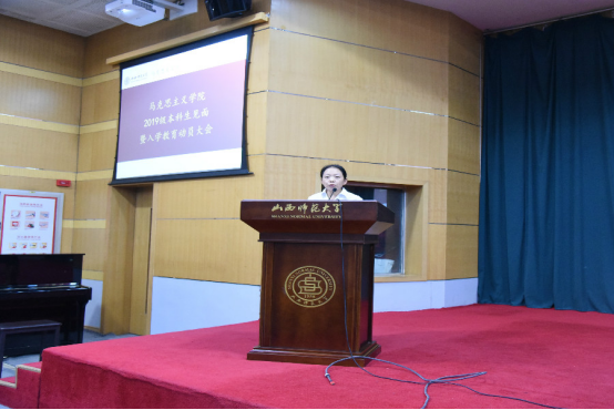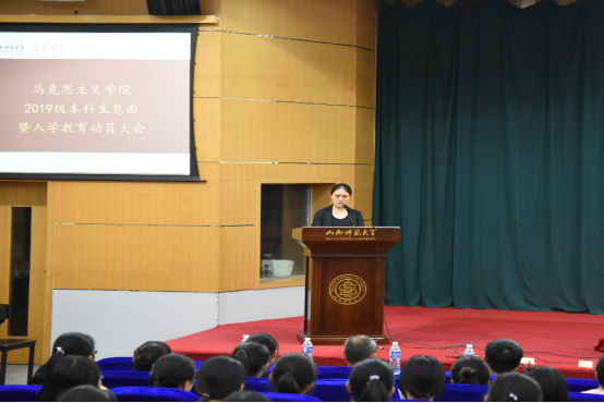 雄厚的师资力量以及良好的学习环境,并对入学新生提出了几点切实有效的学习建议;之后,副院长赵改萍老师详细介绍了专业人才培养方案及毕业要求,为168名新生勾画了四年大学生活的学习蓝图;教师代表本志红老师向新生介绍了大学生活的特点,分享了在大学学习的经验,从而帮助2019级新生更好的适应大学生活;随后,思想政治教育专业1901班魏莲佳同学作为新生代表发言,她表示将会在未来的大学生活中努力学习,严于律己,最后成就自我。